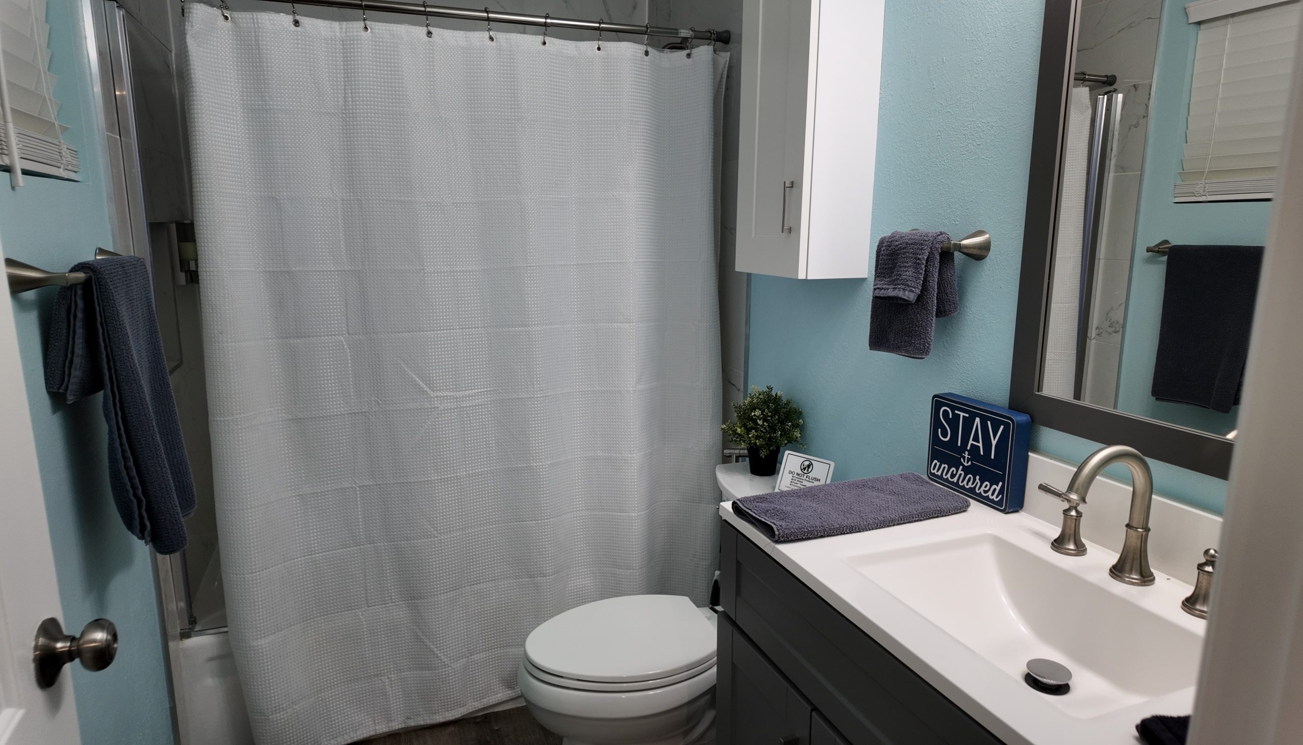 Deja Blue features two updated bathrooms. The hallway bathroom has quartz countertops, an upgraded tub and shower, and calming powder blue walls. The second bedroom bathroom boasts double sinks, a large mirror, ample storage space, and a luxurious walk-in shower.
