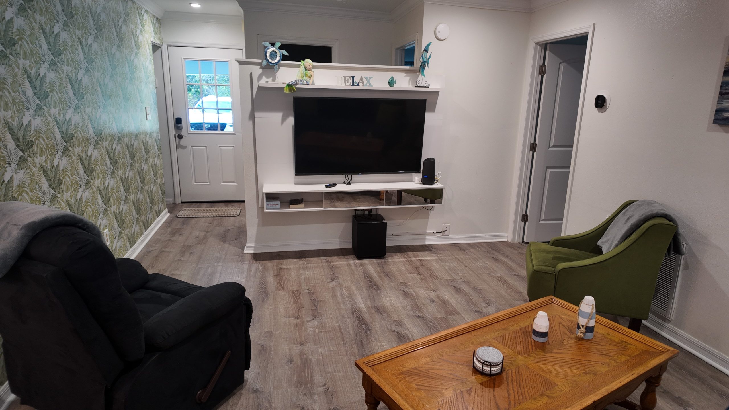 Our living room offers a cozy and stylish ambiance, with a spacious blue couch, stylish armchairs, and warm wooden flooring. The open-plan layout seamlessly connects the living room to the kitchen dining area, perfect for quality family time. Enjoy your favorite shows on the flat-screen TV while lounging comfortably. Our living room strikes the perfect balance of comfort and style for relaxation and entertaining.